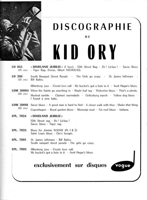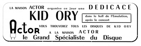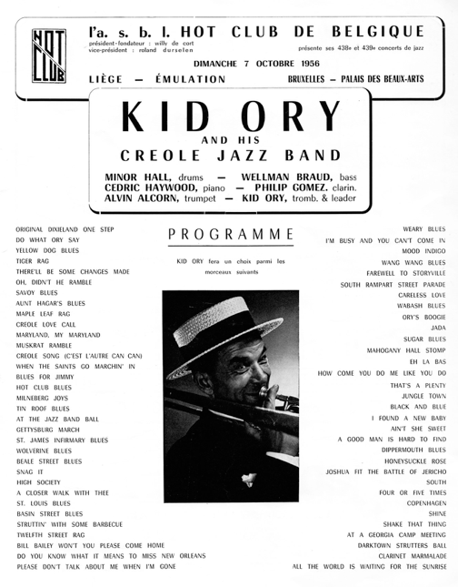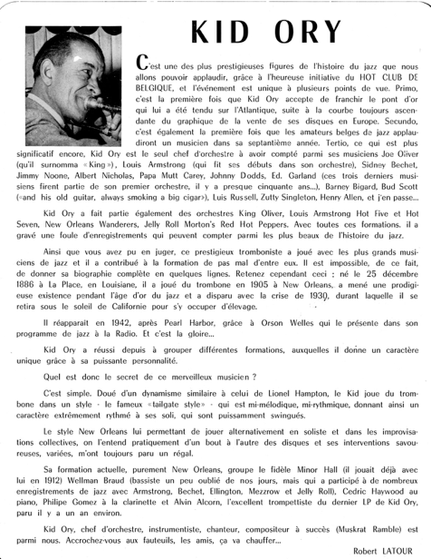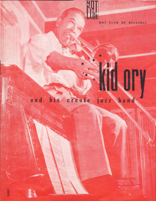 On the Hot Club de Belgique's initiative, we will soon greet one of the most prestigious figures in the history of jazz music, and it is a most unique happening in several respects. First, it is the first time Kid Ory has agreed to cross the golden bridge that has been built for him across the Atlantic, following his ever increasing sales figures in Europe. Second, it is also the first time Belgian jazz lovers will cheer a seventy years old musician. Third, even more significant, Kid Ory is the only bandleader to ever have had within his band Joe Oliver (whom he dubbed "King"), Louis Armstrong (who made his debut in his orchestra), Sidney Bechet, Jimmie Noone, Albert Nicholas, Papa Mutt Carey, Johnny Dodds, Ed Garland (the latter three were part of his first band, almost fifty years ago...), Barney Bigard, Bud Scott ("and his old guitar, always smoking a big cigar"), Luis Russel, Zutty Singleton, Henry Allen, among others...