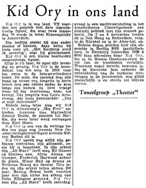 Kid Ory still blows his bass sounds, his glissandi, as when he started. His "All Stars" orchestra comprises of Phil Gomez on clarinet , Alvin Alcorn on trumpet, Cedric Haywood behind the piano, Minor Hall on drums and bassist Wellman Braud. Three members of his orchestra count together 200 years. Bassist Braud has given the rhythm to Duke Ellington's orchestra during fourteen years. Kid Ory and his "All Stars" enthralled a silent audience with their music on Saturday night in a concert at the Amsterdam Concertgebouw . On 3 and 4 November they will play in The Hague and Rotterdam, respectively at the Kurzaal and in the Ahoy Hall (sic. Riviera Hall).