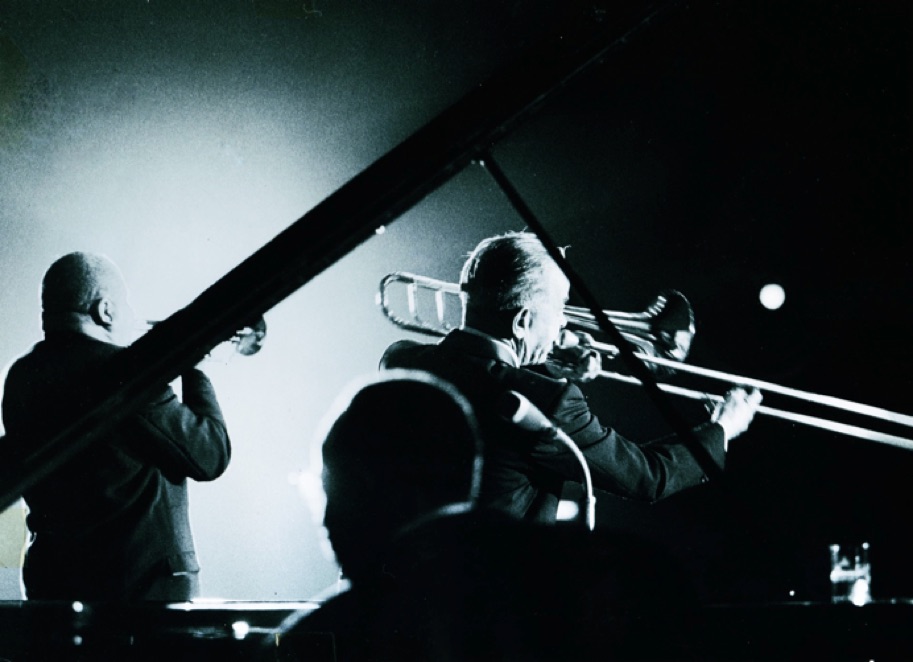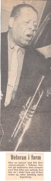 Translation: After the concert with Kid Ory´s veteran orchestra in Falkoner Centret, the all time great trumpet man Red Allen went to a night-club, where he was in better shape than during the concert and received greater admiration.