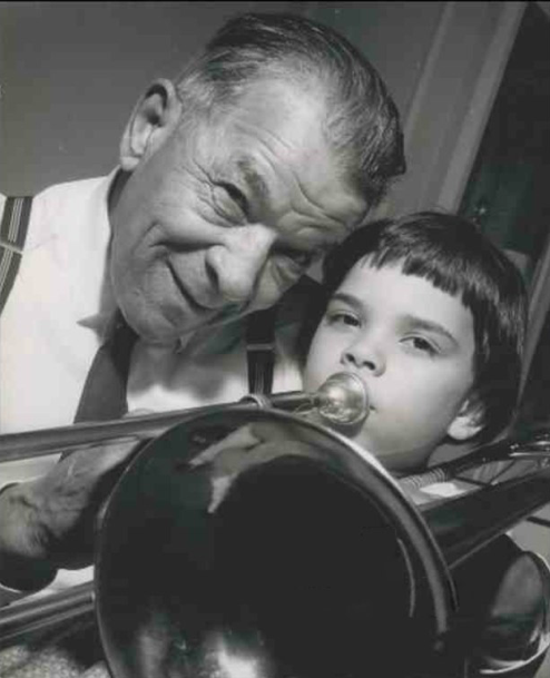 72 year old trombonist in London - 72-year old ”Kid” Ory, one of the great trombonist of jazz, pictured in London yesterday with five year old daughter, Boo-Boo, who is seen here blowing the horn. Also arriving with the ”Kid” was his wife , Barbara.