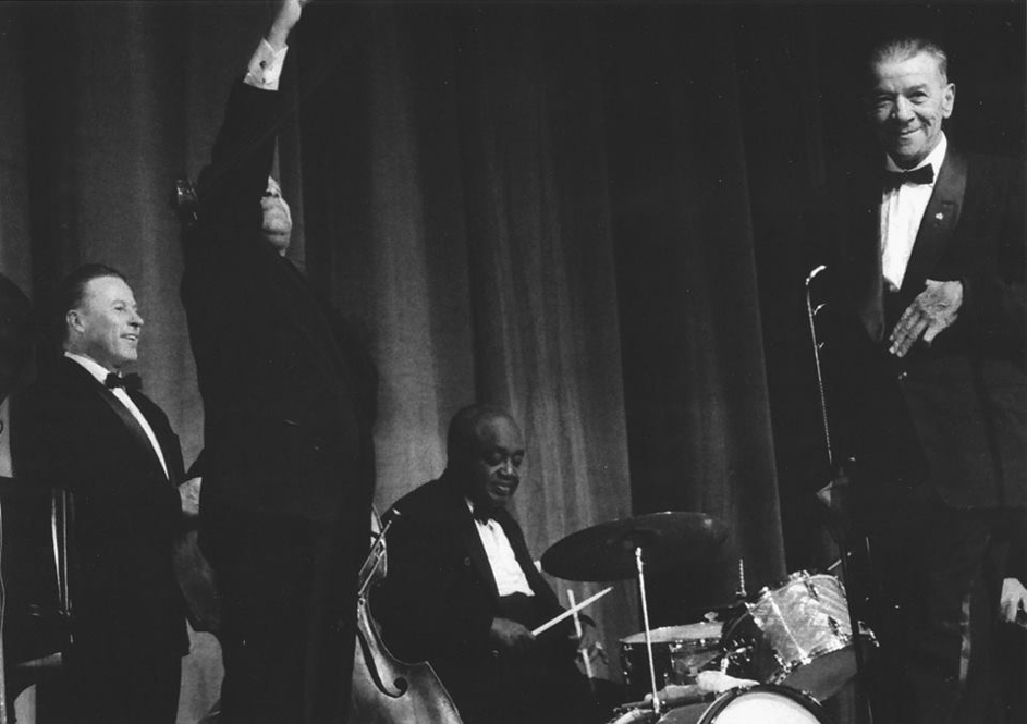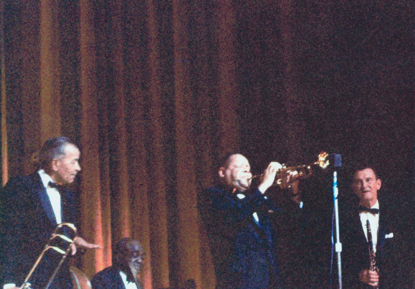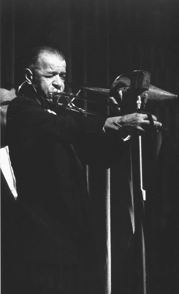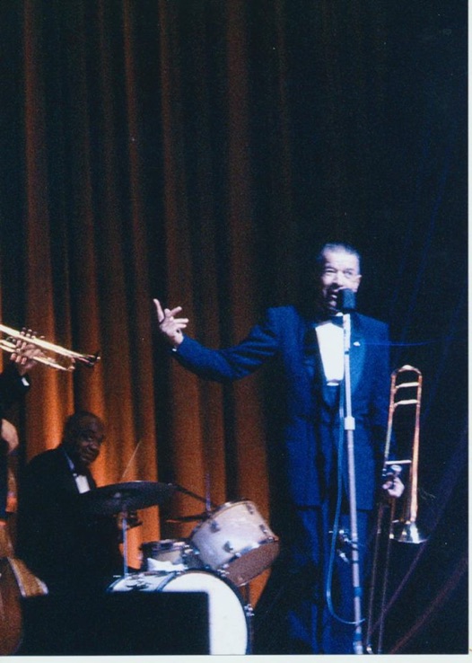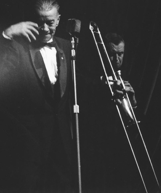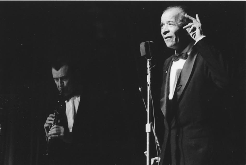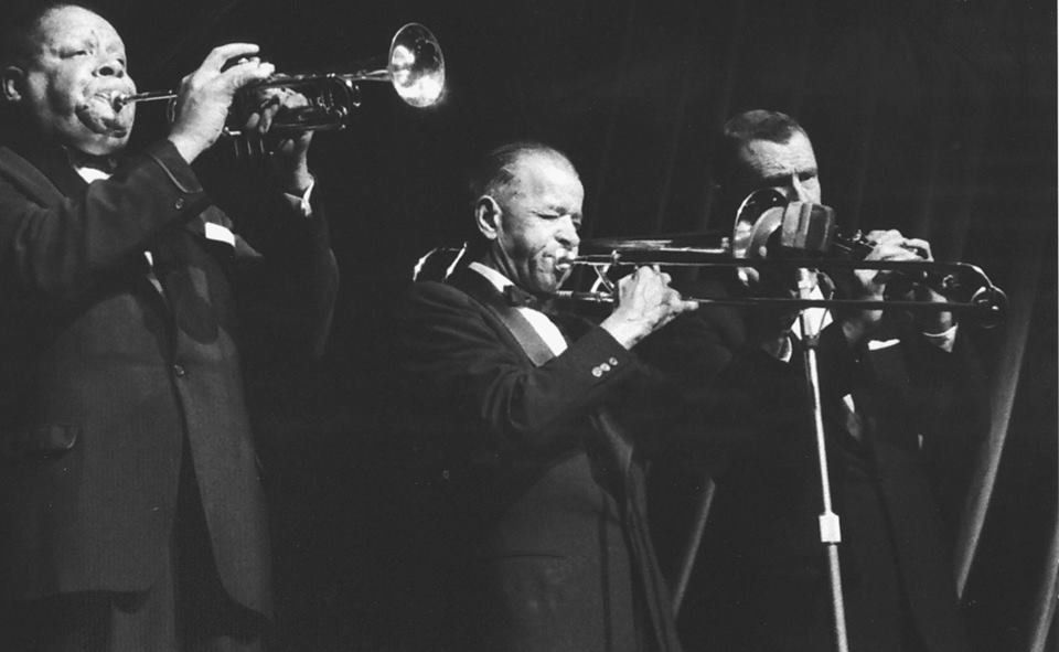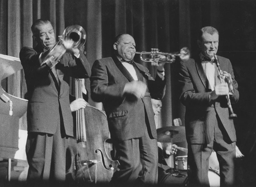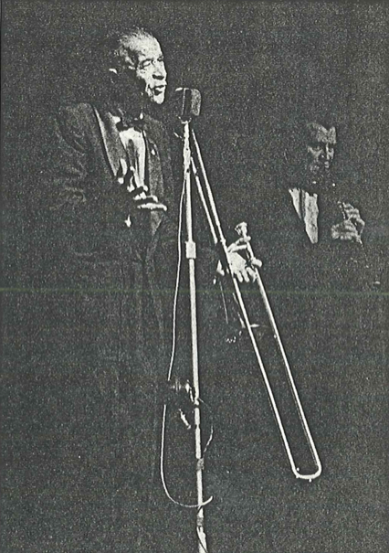 Kid Ory at a London concert. Bob McCracken is on the right.