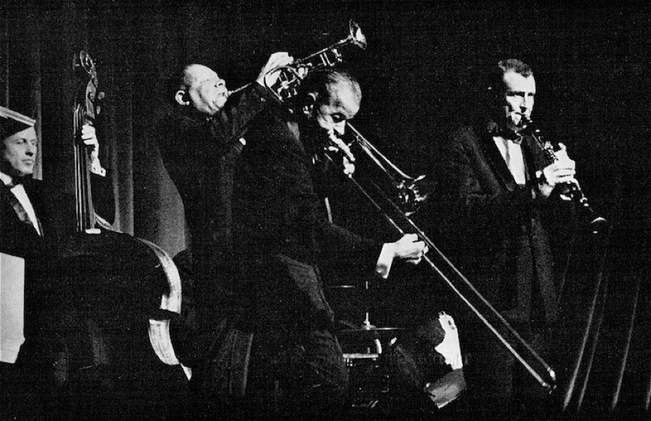 Tony Standish :The wonderful Ory band at Hammersmith in 1959. Kid Ory, Alton Redd, and Red Allen. A bit grainy, due to "available" light - the B&W shots were better.