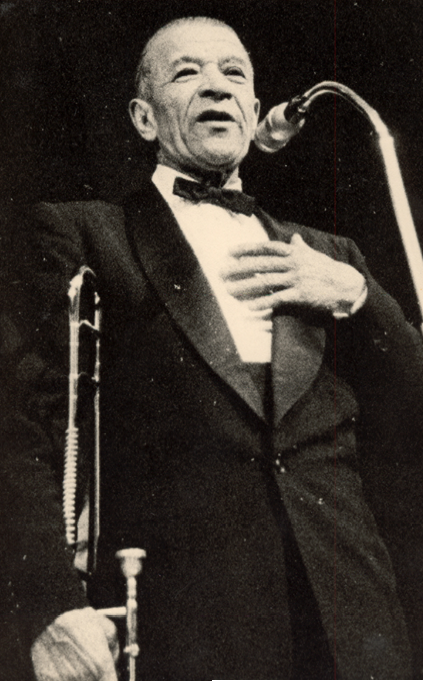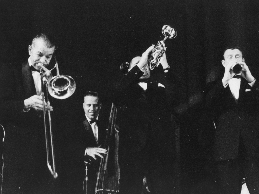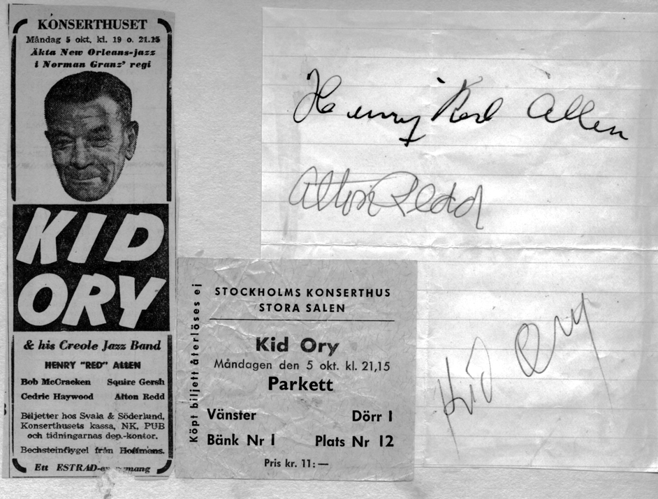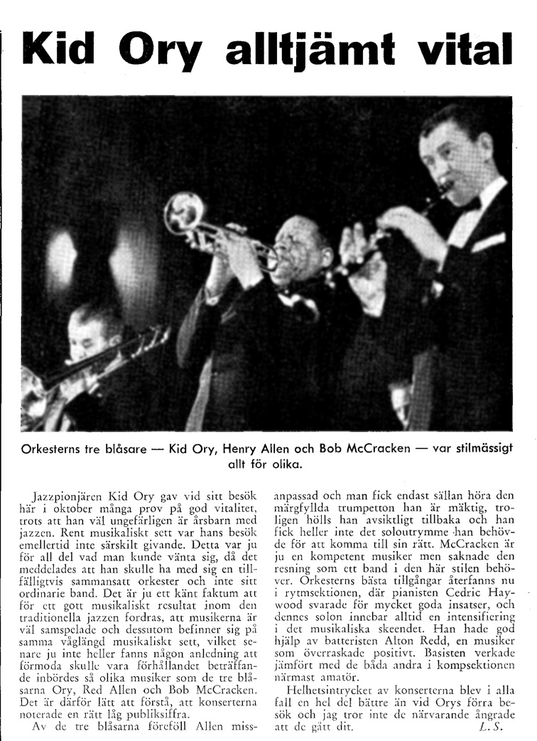 Jazz pioneer Kid Ory gave during his visit in October, many examples of good vitality, despite that he was born the same years as the birth of jazz. Musically speaking, his visits not very rewarding. This was what one might expect, since it was announced that he would bring a temporarily assembled orchestra and not his regular band. It's a known fact that for a good musical performance in traditional jazz, musicians are required to interact well and also that they are at the same wavelength musically. There was no reason to assume that this was the case considering such different musicians as the three blowers Kid Ory, Red Allen and Bob McCracken.