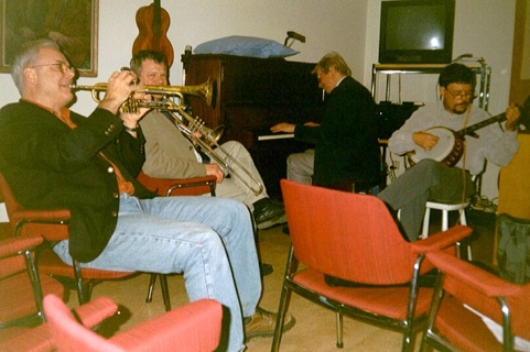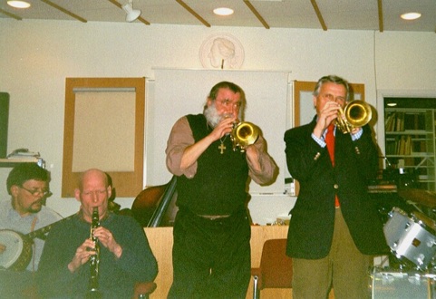The part of the evening in the premises of the Centre was as always concluded with live New Orleans music. On the stage we heard our members Christer Fellers (tp), , Arne Högsander (cl), Håkan Rosenqvist (bjo), Lars Sunbom (tp), Lasse Mattson (p).