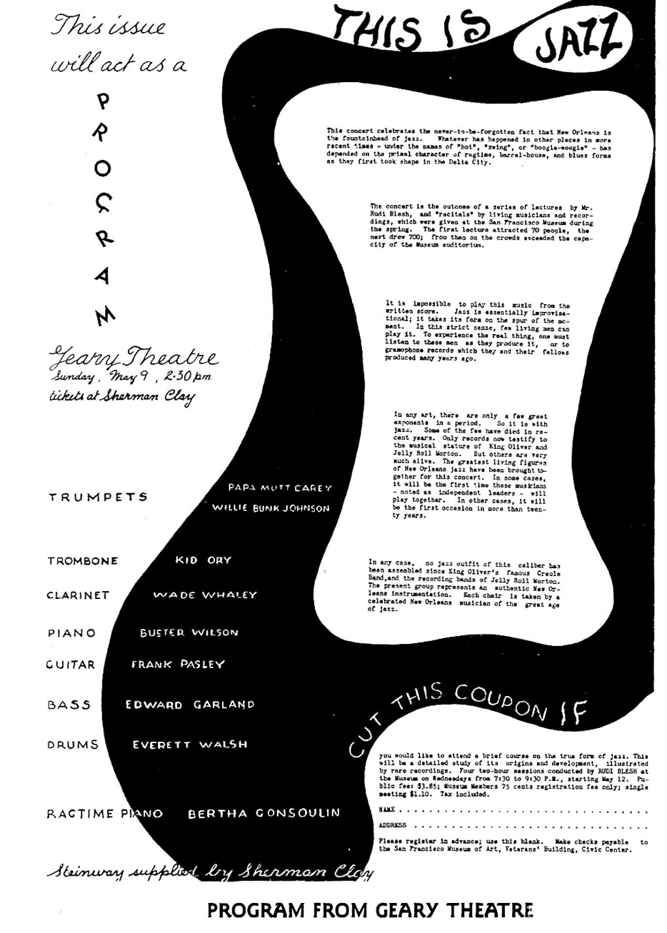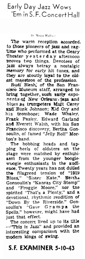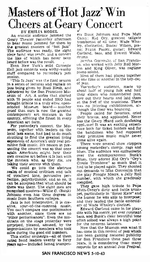 Bunk Johnson tp, Mutt Carey tp, Kid Ory tb, Wade Whaley cl, Buster Wilson p, Frank Pasley h, Ed Garland b, Everett Walsh dm.