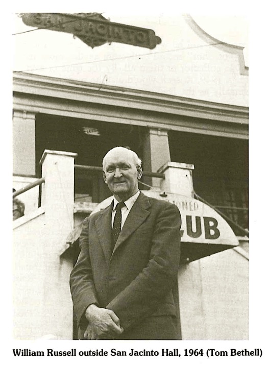 The Hall was built during the 1920`s and was named for the Battle of San Jacinto, an 1836 outburst that ended Mexico`s attempts to conquer the Republic of Texas. Locally the hall was usually referred to as San Jacintas. It had been rented to local organizations to house dances ever since it opened. There were apartments upstairs and Russell always had to worry that someone up there would play his radio too loud and spoil a recording, but apparently the neighbors didn`t intrude.