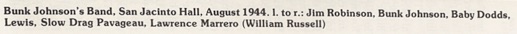 When Russell returned in July 1944 to record Bunk for American Music he decided to use one of the old dance halls then dotting New Orleans` older neighborhoods. He rented San Jacinto Hall, 1422 Dumaine St, for $10 a night.