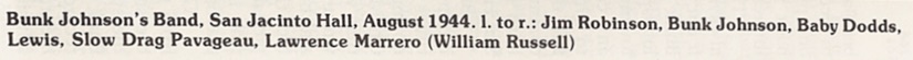 San Jacinto Hall received a great reputation based on a few weeks of activity in 1944. As usual, the protagonist was Bill Russell. In the 1940`s New Orleans was not brimming with recording studios, and the few studios there were weren`t interested in recording black musicians. When Russell and friends first recorded Bunk Johnson they used a piano warehouse at Grunewald Music.