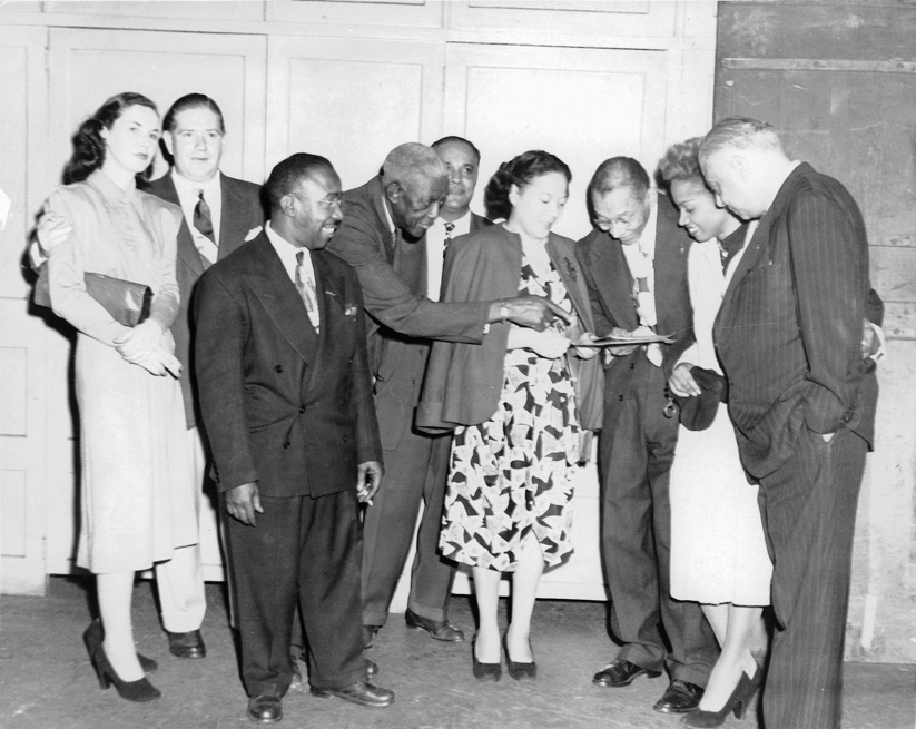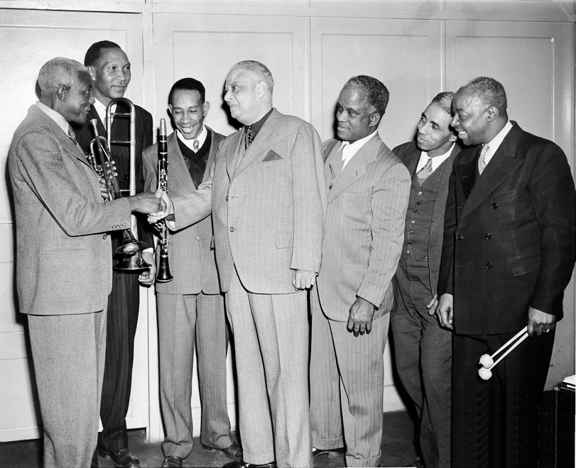 Unknown lady, Wild Bill Davison, Jimmy Archey, Bunk, Albert Nicholas, Conchita Nakatani, Pops Foster, Betty Smith-Marshall and George Baquet at the concert in Philadelpia1945.