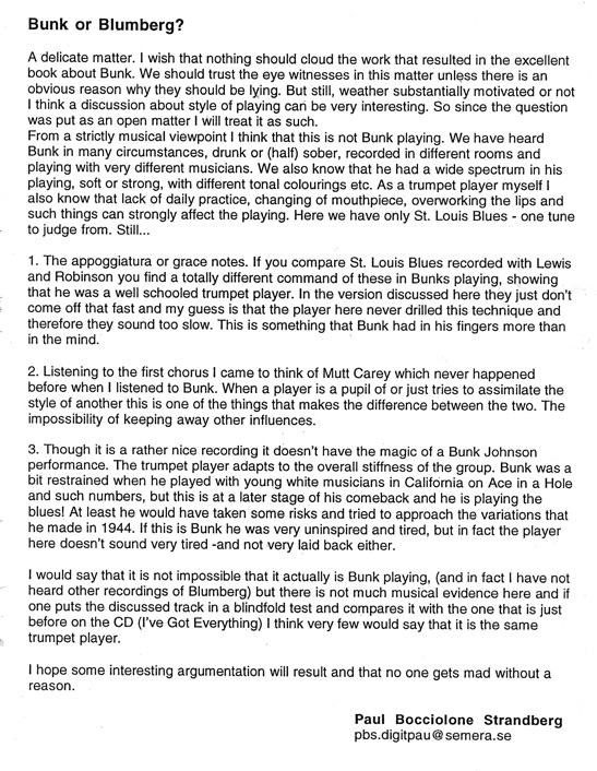 As Bunk Johnson´s disciple Jerry Blumberg, was in town (NYC) at that time, there has been some discussions of wheather it really is Bunk who is playing at that record or presumably Jerry Blumberg. In a ”letter to the editor” (27) Mike Pointon puts up the question again. He refers to a meeting with Cuff Billett (like Mike Pointon, a distinguished member of the Swedish Bunk Johnson Society), who claims that it is not Bunk, but Jerry Blumberg playing on that recording, based on careful aural examination. Mike Pointon is of the same opinion and according to the letter and Louis Lince.
