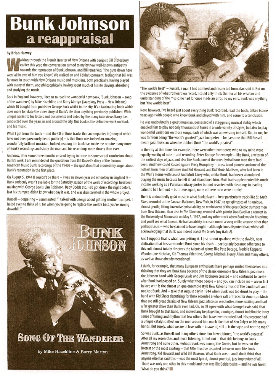 Regarding Mike Pointon´s article in “Just Jazz” regarding the “St Louis Blues” on the CD of my jointly authored “Song of the Wanderer – Bunk Johnson” Book. There is no question that it is Bunk & not Jerry Blumberg. Jerry is a friend of mine and we sat in my house identifying the acetates marked “Bunk at Caravan” that I got from Paul Larsen, the “real” Bunk expert. Paul says it was Bunk… Jerry Blumberg says it was Bunk and he was in the audience that night. In fact Jerry remarked on the variations on Bunk´s solo on this particular song. He said “Bunk played in a much more staccato way when he had been drinking but he still made his variations.” That from Jerry while listening to this track.