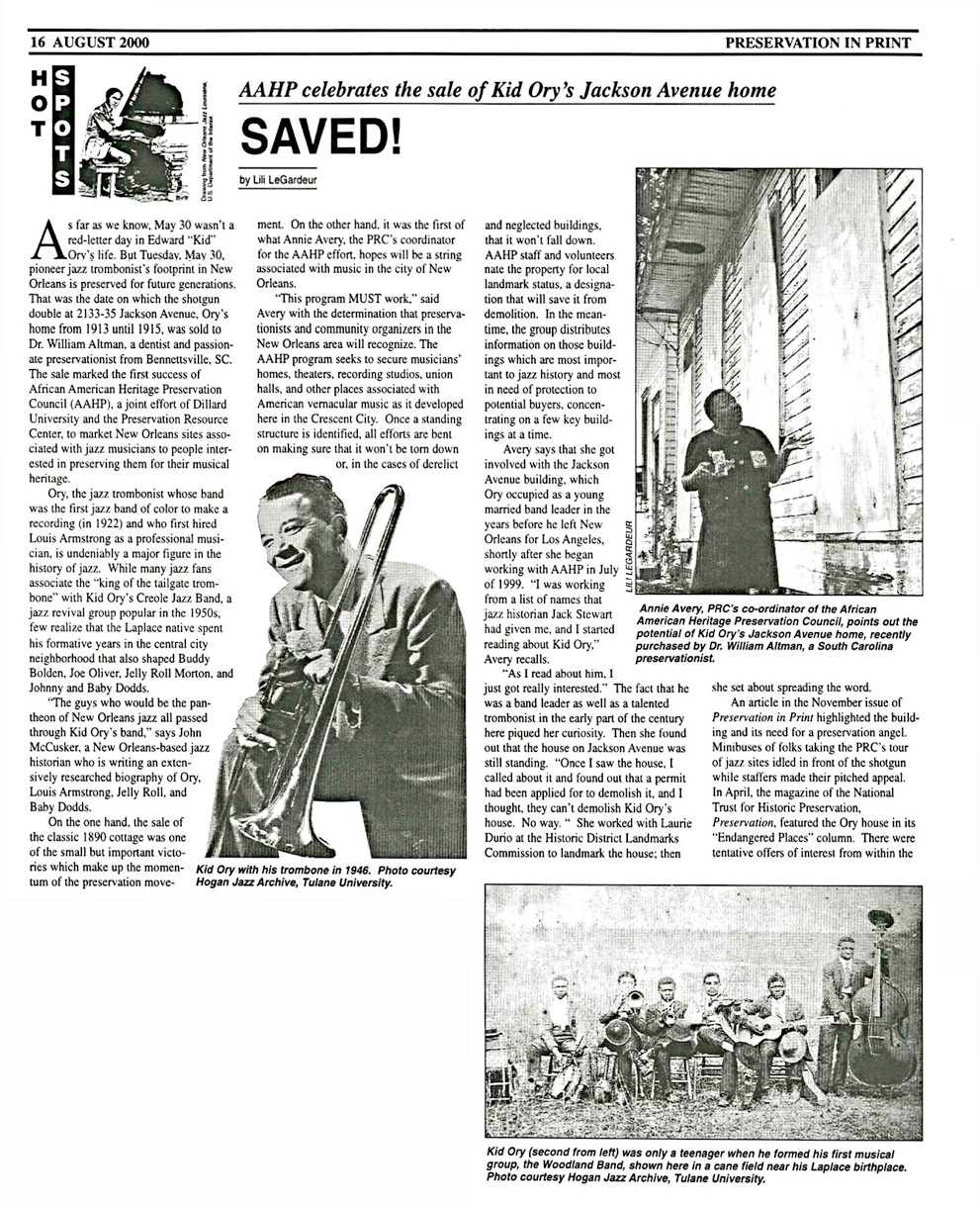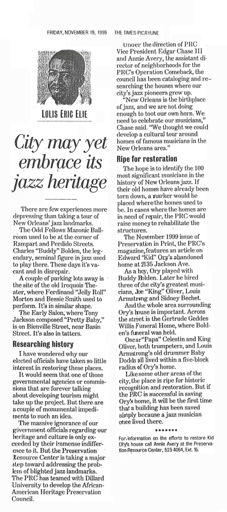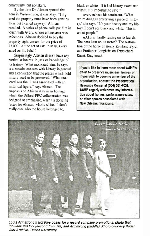 For the restoration of Kid Ory´s house in 2002, credit is given to "New Orleans Jazz Commision, Preservation Resource Centre."