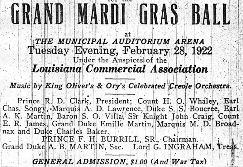 King Oliver and Kid Ory join forces to play Mardi Gras Ball in Oakland in 1922.