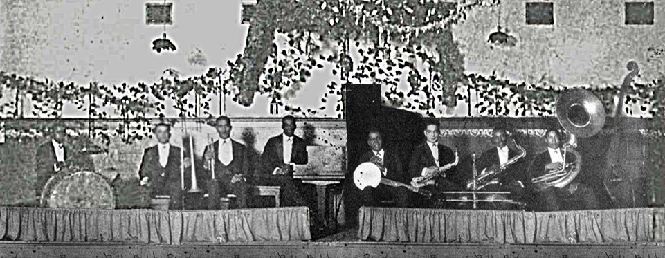 Kid Ory´s band in Los Angeles 1922. (?) dr, Kid Ory tb, Mutt Carey tp, Fred Washington p,
