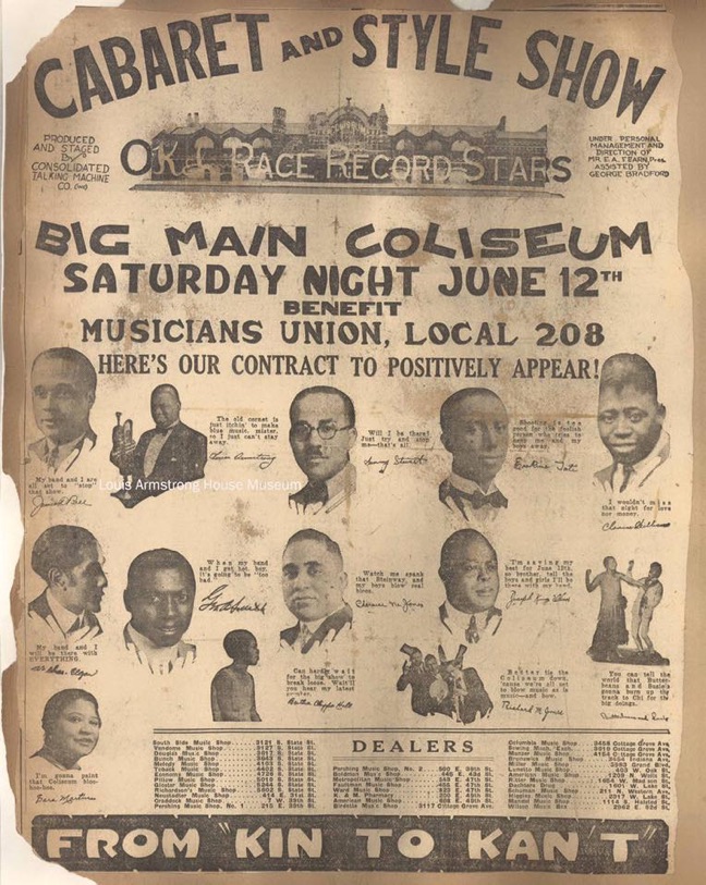 1926, Louis Armstrong and His Hot Five made one of their only public appearances, performing at the big "Cabaret and Style Show" in Chicago! The event was a benefit to support the musician's union and featured numerous "OKeh Race Records Stars" including King Oliver, Clarence Williams, Richard M. Jones, Butterbeans and Susie, Bertha "Chippie" Hill and more.