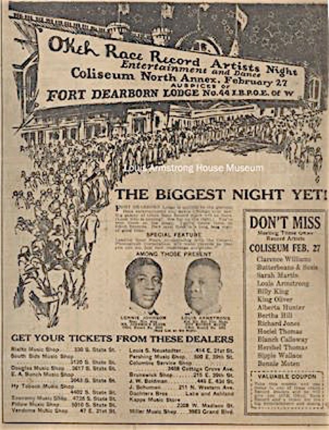 1926 was "OKeh Race Record Artists Night" in Chicago, featuring live performances by Louis Armstrong and His Hot Five, Lonnie Johnson, Clarence Williams, Butterbeans and Susie, King Oliver, Alberta Hunter, Bennie Moten, Sippie Wallace and many more!
