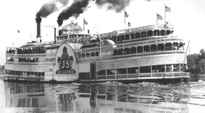 The JS Delux: Built at Dubuque, IA, in 1896 as the QUINCY for the Diamond Jo Line for the St. Louis-St. Paul trade. Sold to Streckfus and completely rebuilt into the super-excursion boat JS DELUXE in 1919 at St. Louis. Was the flagship of the Streckfus Line until the PRESIDENT came out in 1934. Dismantled at St. Louis, 1939.