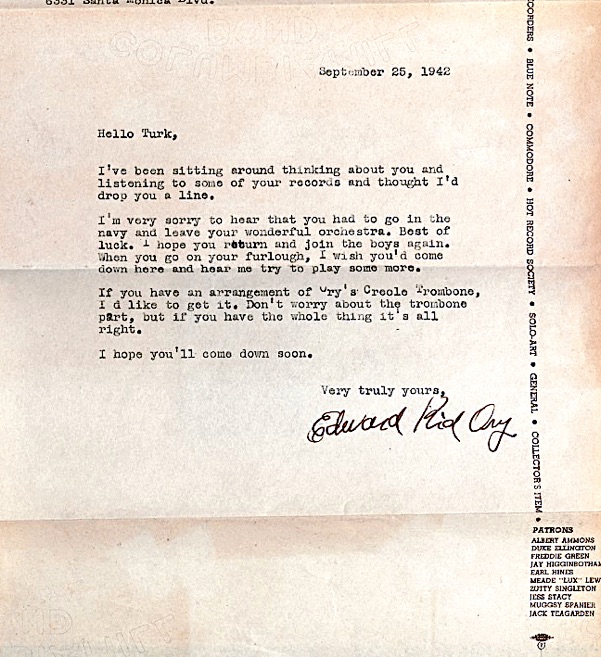 1942 KID ORY WRITES A LETTER TO TURK MURPHY