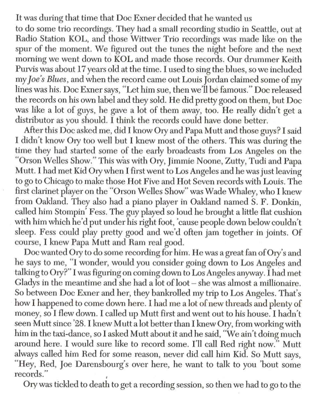 Joe Darensbourg cl, Alton Redd dm, Ed Garland b, Kid Ory tb, Buster Wilson p, Mutt Carey tp, Bud Scott g.