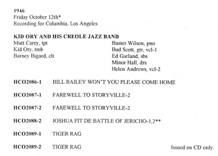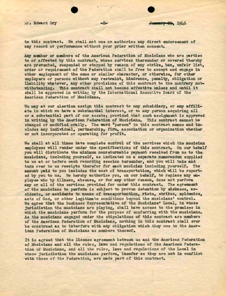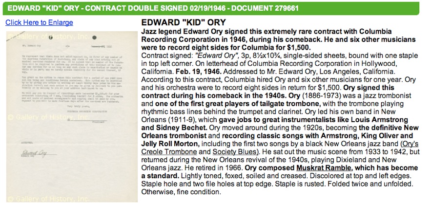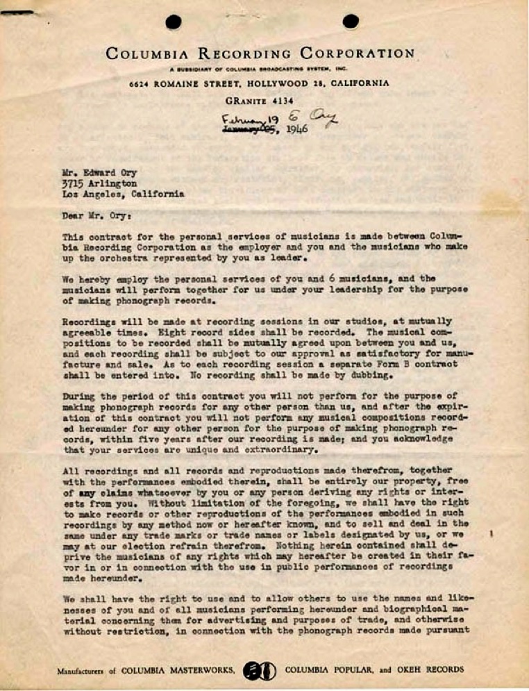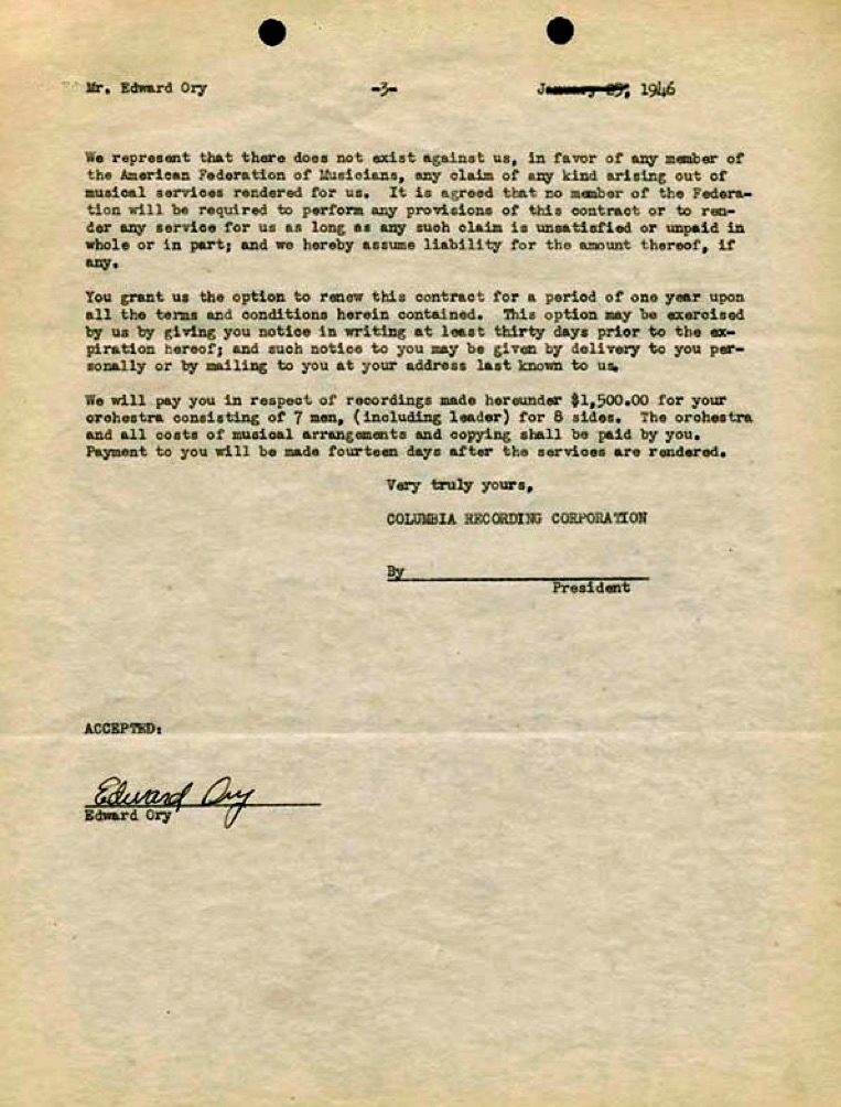 Here is a scan of the contract Kid Ory signed with Columbia in february 1946 in order to record 8 pieces of music.
