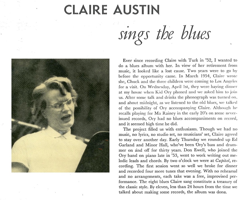 Session for Good Time Jazz 2 April 1954. Claire Austin vo, Kid Ory tb, Ed Garland b, Don Ewell p.