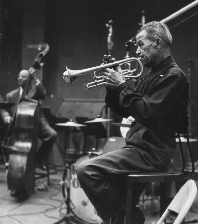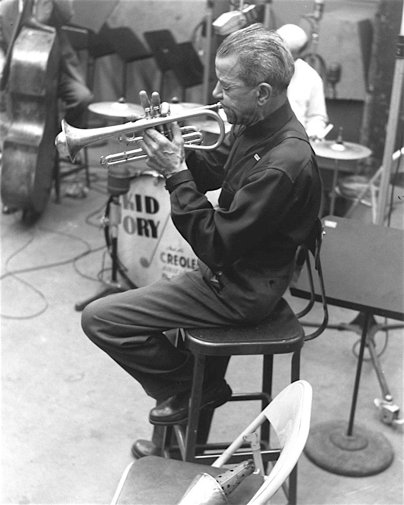 Kid ory playing the cornet. Ed Garland b and Minor Hall dm are also present.