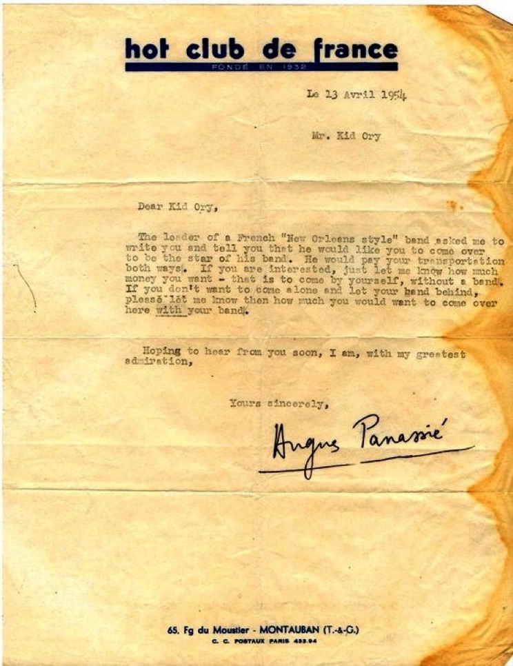 1954 letter from Hughes Panassié inviting Kid Ory to play in France.