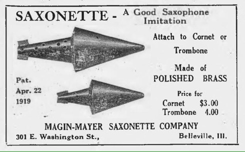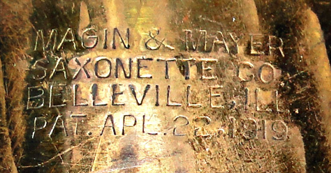 I have used a copy that I had made for years, but to have the original thing makes me overjoyed. It is stamped on the side, Magin & Mayer Saxonette Co., Belleville ,Ill. Patent apl. 1919.