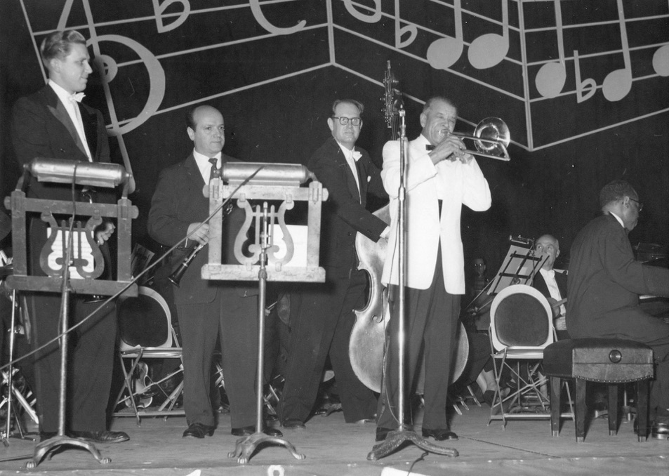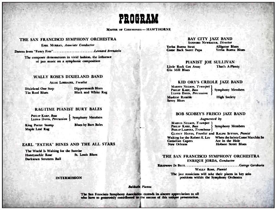 The San Francisco Symphony Orchestra Members: Marvin Nelson trumpet, Unknown clarinet, Philip Karp bass, Lloyd Davis percussion , Kid ory and Cedric Haywood piano.