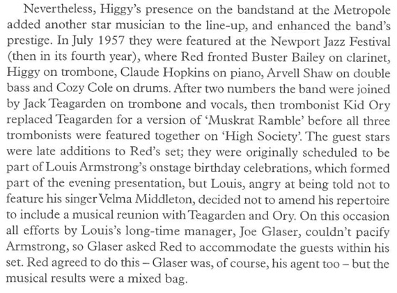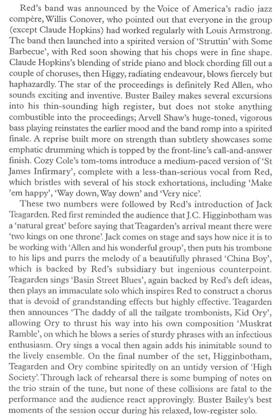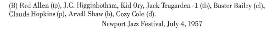 The Newport Jazz Concert. Arvell Shaw b, Jack Teagarden tb, Kid Ory tb, J C Higginbotham tb, Red Allen tp, Buster Bailey cl.