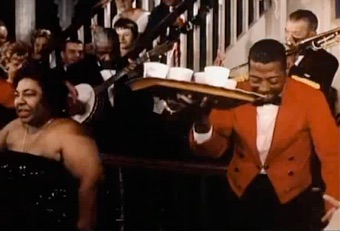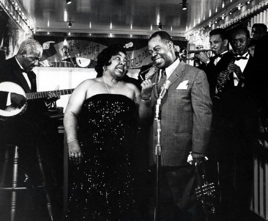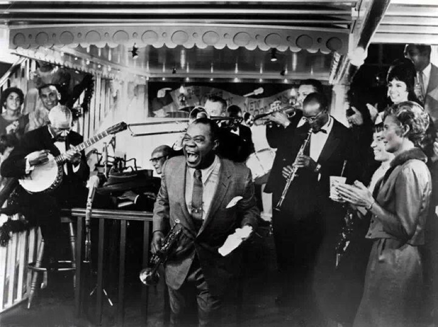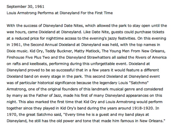 Johnny St Cyr., Texas born: Monette Moore (1902-1962), Kid Ory, Louis Armstrong, Mike DeLay, and Polo Barnes, Disneyland, 1962.