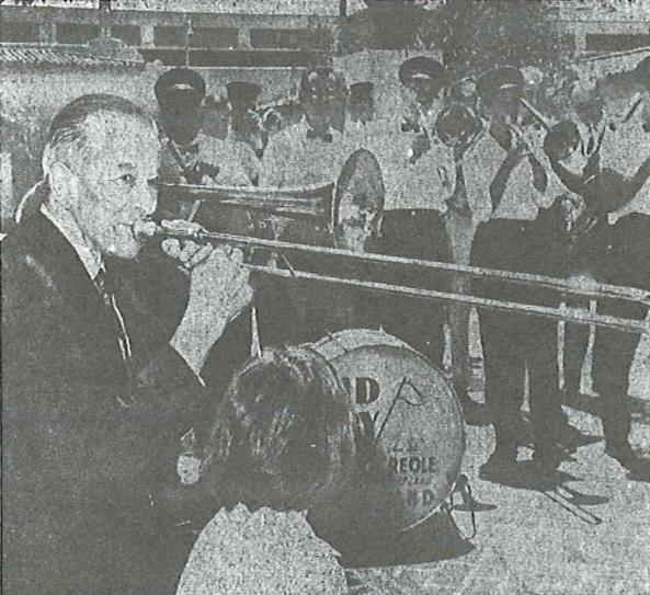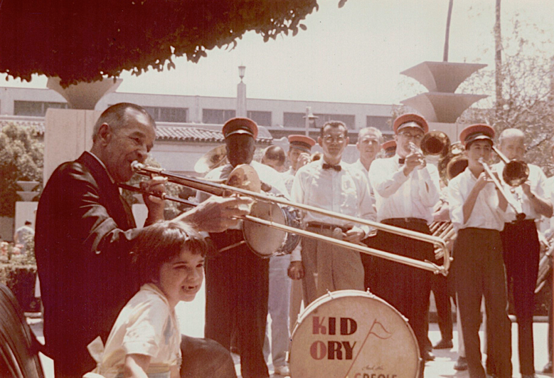Kid Ory 74, joins in with his famous trombone as the Southern California Hot Jazz Society gives him a musical greeting in Los Angeles, after five years living in the Bay area.