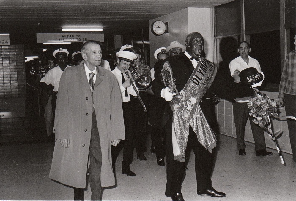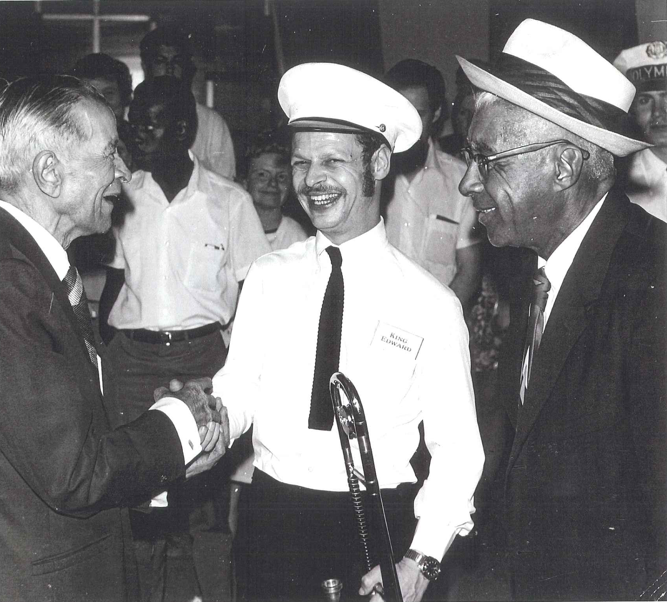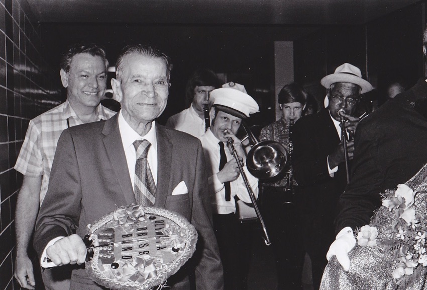 Floyd Levin, Kid Ory with Grand Marshal fan presented by Fats Houston, Orange Kellin,cl Mike Casimir tb, Lars Edegran cl. Earl Humphrey tb.