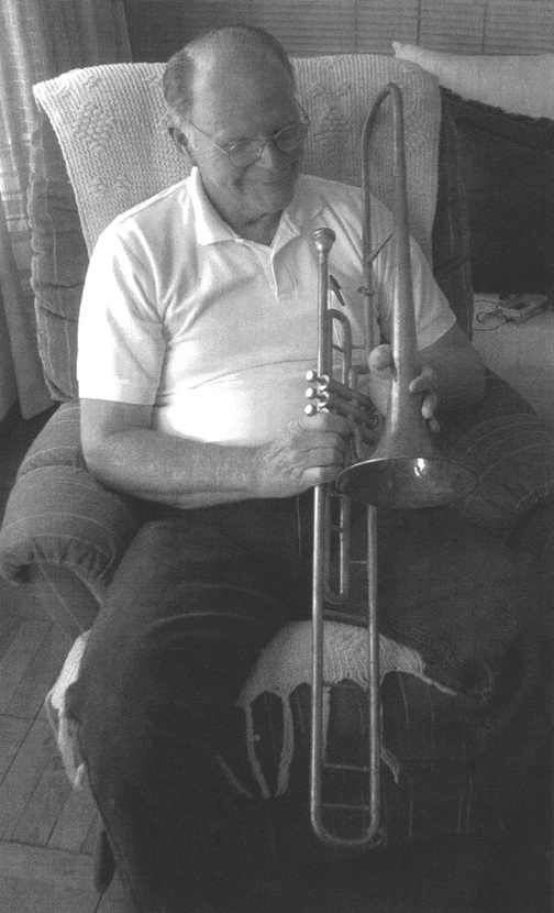 ARHUR GANUNG, KID ORY´S STEPSON, HOLDING KID´S 1910 SILVER PAN AM VALVE TROMBONE