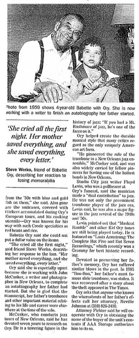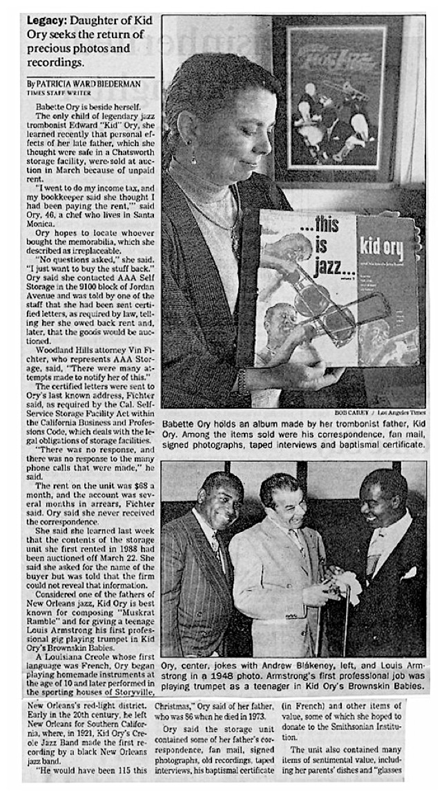 The only child of legendary jazz trombonist Edward "Kid" Ory, she learned recently that personal effects of her late father, which she thought were safe in a Chatsworth storage facility, were sold at auction in March, because of unpaid rent.