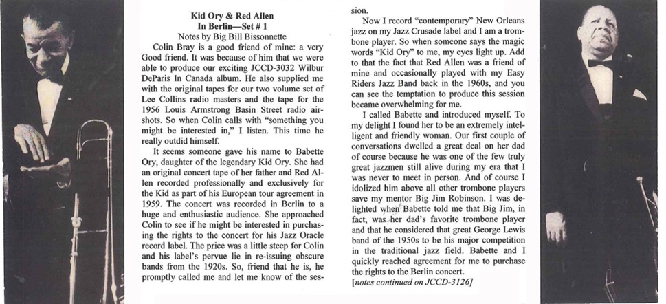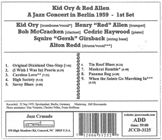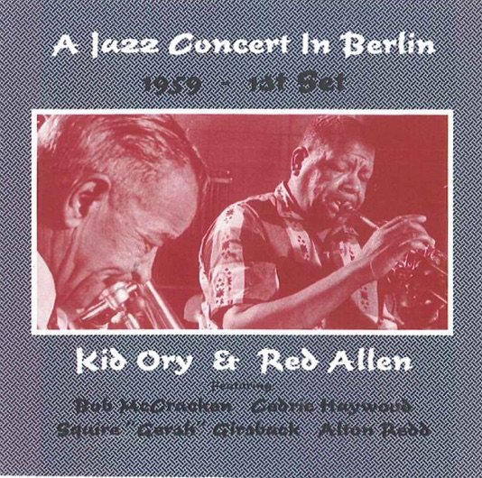 The tour these recording are from was one of many Ory made, but the first outside America undertaken by Allen. The story behind the albums is quite interesting. Kid Ory apparent\y had commissioned the recordings for his own pleasure. They resurfaced years later when his daughter, Babette, offered them to jazzman Colin Bray, who advised Big Bill Bissonnette, who then bought the rights to issue them. The 2 CDs comprise of two sets from a 1959 concert in Berlin. Other recordings from the tour are available elsewhere(see Storeyville records STCD6038 ‘In Denmark’ released in 1998, which has many of the tunes played at the Berlin Concert, and there also may be old copies on vinyl of albums put out by Rarities and Queen Disc floating around).