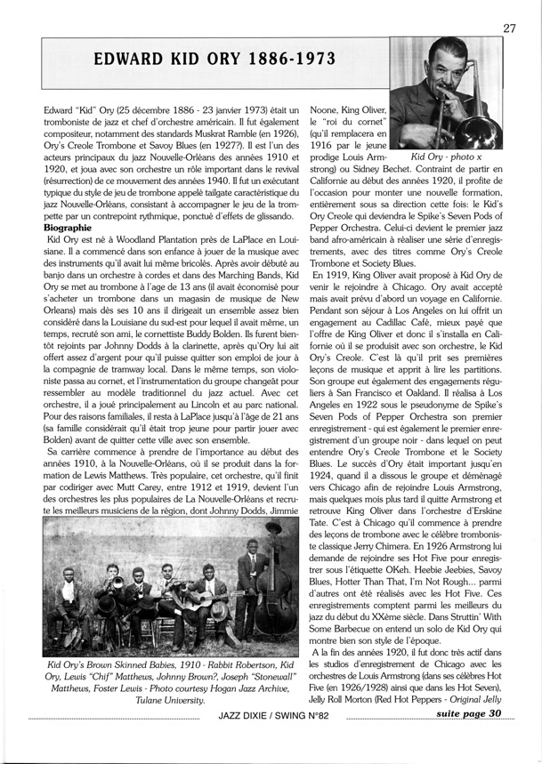 Edward "Kid" Ory (b. December 25th, 1886 - d. January 23rd, 1973) was an american jazz trombonist and band leader. He also composed several standards as Muskrat Ramble (1926), Ory's Creole Trombone and Savoy Blues (1927 ?). He was one of the main figures of New Orleans jazz in the 1910s and 1920s and played an important part in the revival which took place in the 1940s. He was a typical player of the tailgate style, accompanying the trumpet lead with a rhythmic counterpoint interspersed with sliding effects.