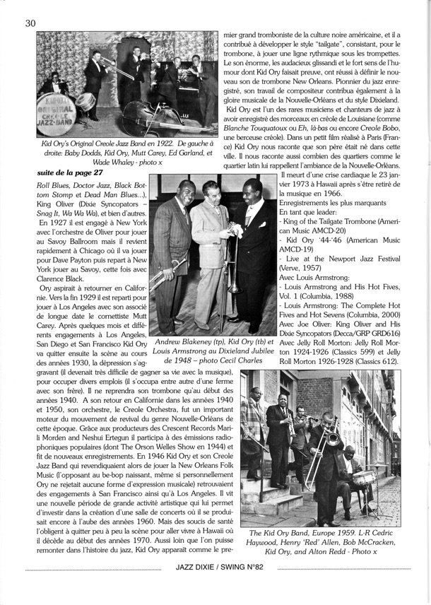 Kid Ory was one of the few musicians and singers to record songs in Louisiana creole (Blanche Touquatoux, Eh La-bas, or Creole Bobo, a creole lullaby). In a short movie shot in Paris, France, Kid Ory recalls that his father was born in that city. He also tells how quarters as the Latin Quarter remind him of the atmosphere of New-Orleans.