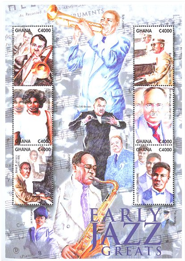 In 2001, the postal service of Ghana issued a serie of stamps dedicated to early jazz greats : Lil Hardin Armstrong, James P. Johnson, Johnny Saint Cyr, Joh, Philip Sousa, Earl Fatha Hines, Bunk Johnson, Paul Whiteman, Coleman Hawkins and Kid Ory are featured on the first leaf.