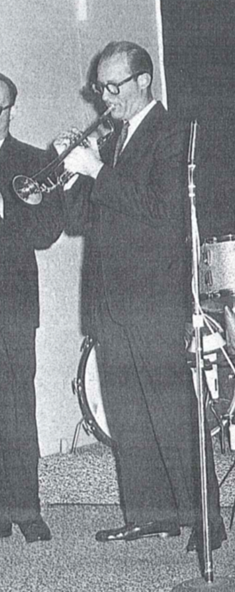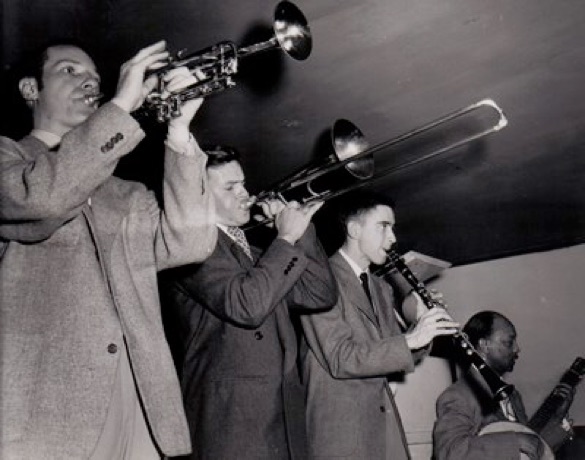 Dick Riley, trumpet, playing with Conrad Janis Tailgate band at Jimmy Ryans around 1950. The banjo player is Danny Barker.