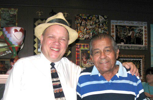 I play trombone in my own style but I was certainly influenced by Ory, Louis Nelson, Jim Robinson and Frog Joseph. On trumpet I play a primitive style like a mix of Kid Thomas, Red Allen, and Kid Sheik. Anyway you can imagine my delight when a few months ago I see this gentlemen walk into my weekly gig at a local New Orleans restaurant. The gentleman is obviously of creole heritage. He comes up to say how much he enjoyed the music and that he "had a great Uncle who played trombone like that in New Orleans. But you probably never heard of him..his name was Ed Ory" . What a pleasant surprise. Attached find a photo of me with Vernon Mitchell. You can easily see the family resemblance.