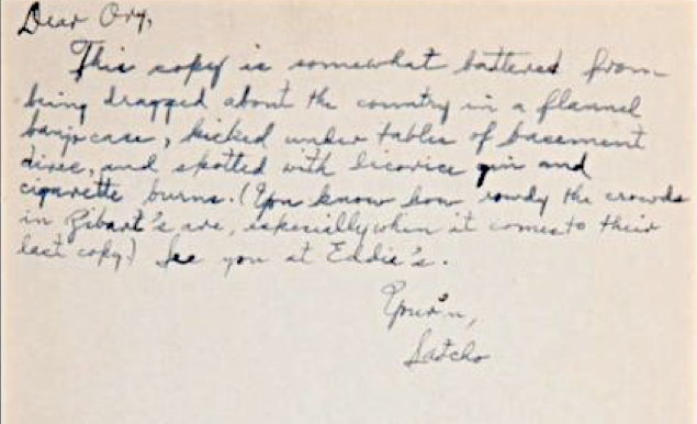 This copy is somewhat battered from being dragged about the country in a flannel banjo case, kicked under tables of basement dinners, and spotted with licorice gin and cigarette burns. (You know how rowdy the crowds in Zibart’s are, especially when it comes to their last copy). See you at Eddie’s. Your’n, Satcho.