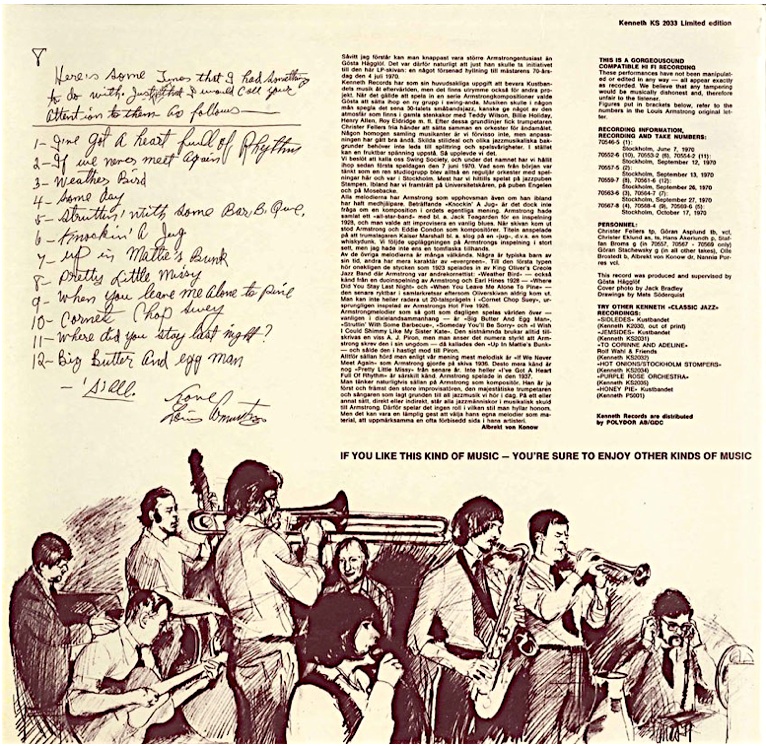 Fotografen Jack Bradley råkade besöka Louis Armstrongs hem i New York när Louis läste baksidestexten till LP-skivan. Han passade på att ta ett foto när Louis läser på skivan.