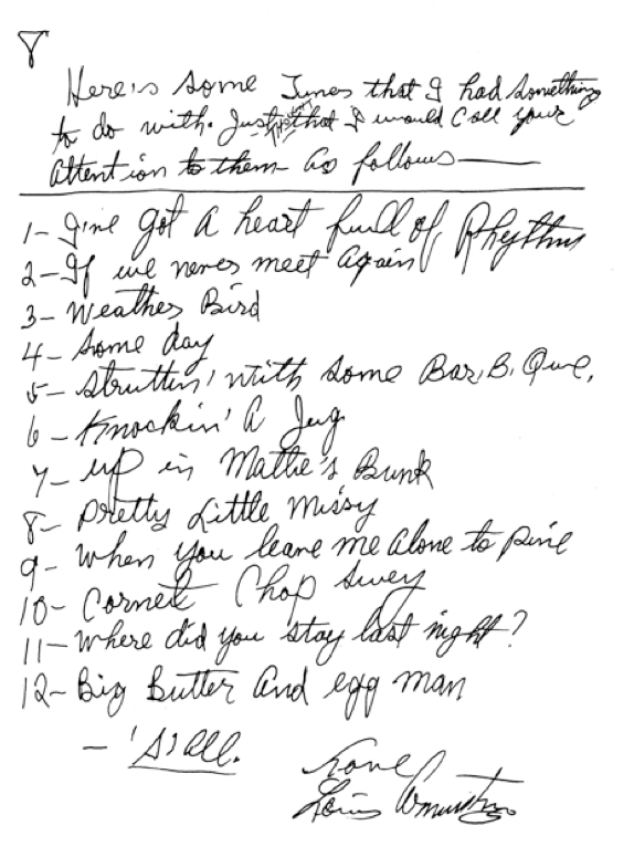 Louis Armstrong föreslog följande tolv melodier som han tyckte att bandet skulle spela in. Observera att Louis föreslog Up in Matties Bunk, den melodi som senare skulle kallas I wish I could shimmy like my sister Kate,